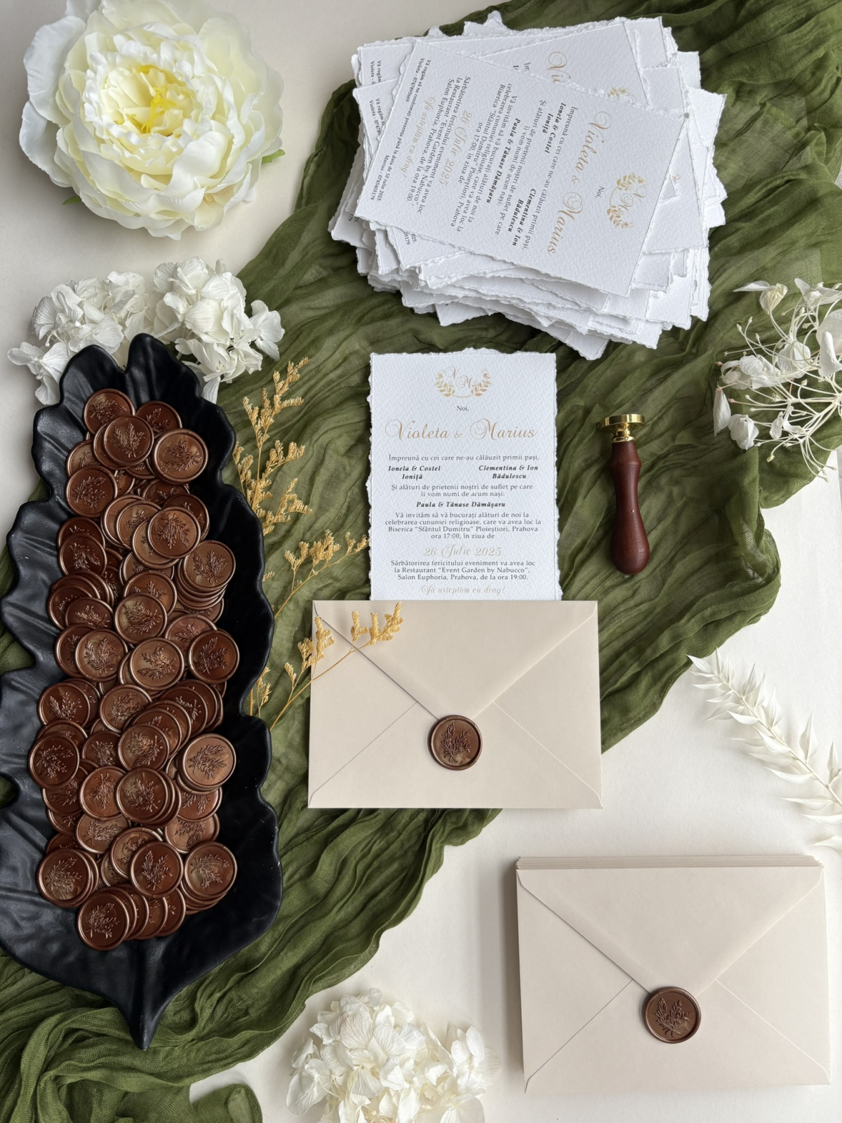 Pentru un plus de eleganță și rafinament, se poate combina cu ușurință cu un sigiliu de ceară, fie că este unul simplu, cu plante uscate sau cu foiță aurie, cu siguranță vei face o alegere inspirată. De asemenea, panglica de mătase, atasată în diverse moduri plicului, sau combinată cu un sigiliu de ceară, poate crea un accesoriu de poveste pentru evenimentul tău.