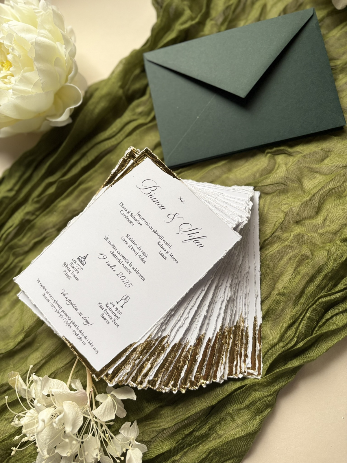 Pentru un plus de eleganță și rafinament, se poate combina cu ușurință cu un sigiliu de ceară, fie că este unul simplu, cu plante uscate sau cu foiță aurie, cu siguranță vei face o alegere inspirată. De asemenea, panglica de mătase, atasată în diverse moduri plicului, sau combinată cu un sigiliu de ceară, poate crea un accesoriu de poveste pentru evenimentul tău.