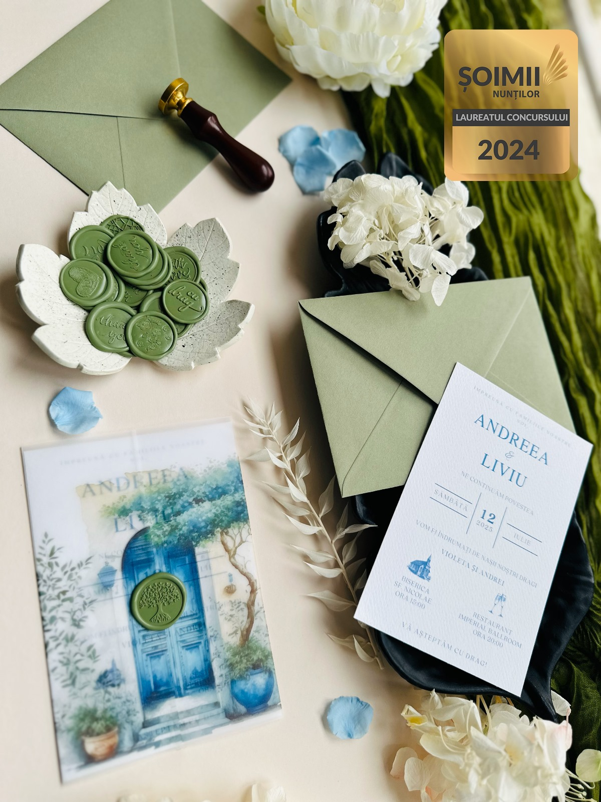 Pentru un plus de eleganță și rafinament, se poate combina cu ușurință cu un sigiliu de ceară, fie că este unul simplu, cu plante uscate sau cu foiță aurie, cu siguranță vei face o alegere inspirată. De asemenea, panglica de mătase, atasată în diverse moduri plicului, sau combinată cu un sigiliu de ceară, poate crea un accesoriu de poveste pentru evenimentul tău.